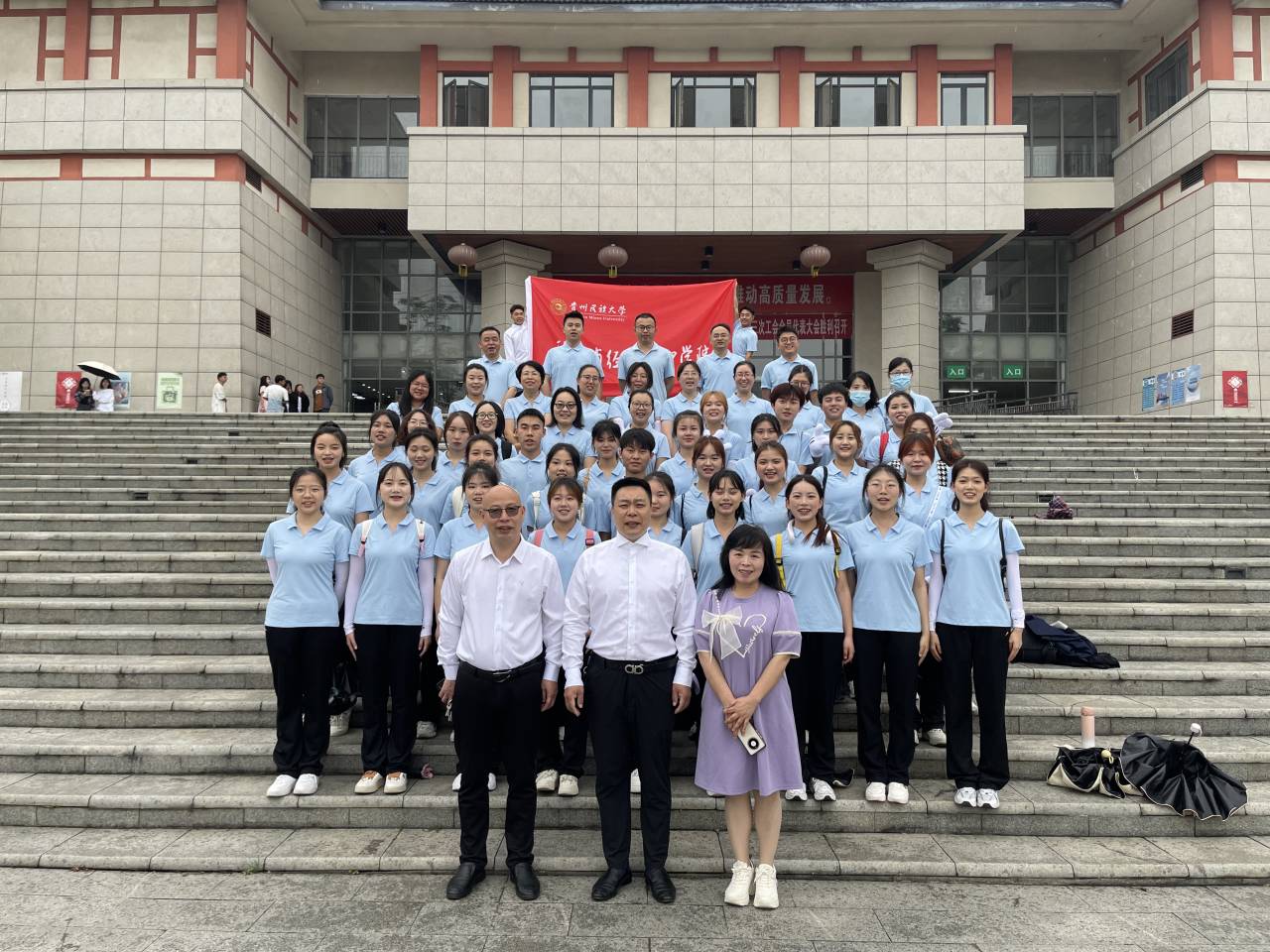 图为学院领导与参加广播体操比赛的师生合影